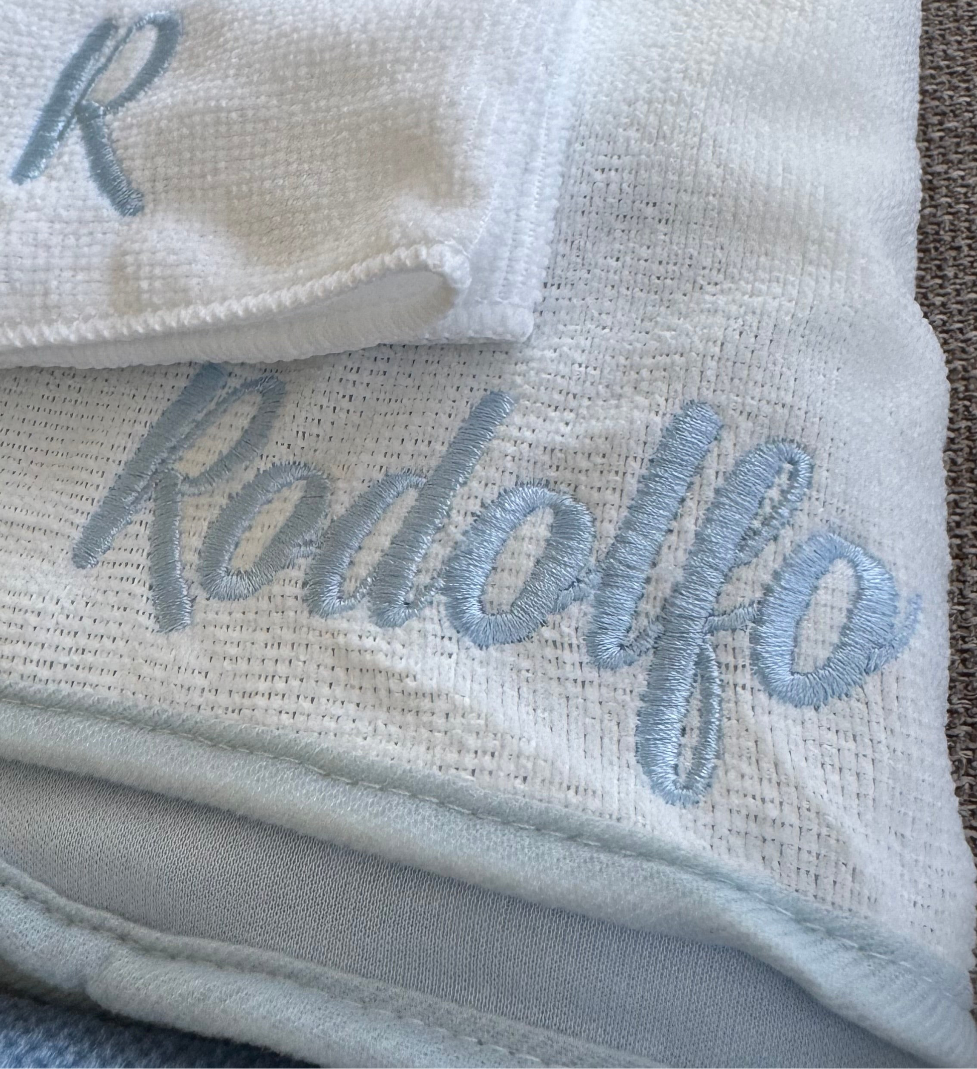 A compact white towel embroidered with the first initial of the name. Perfect for travel or quick cleanups. - Note: the style may varied, the colors are the same … send message if you need see the exact styles we have in the moment you order.